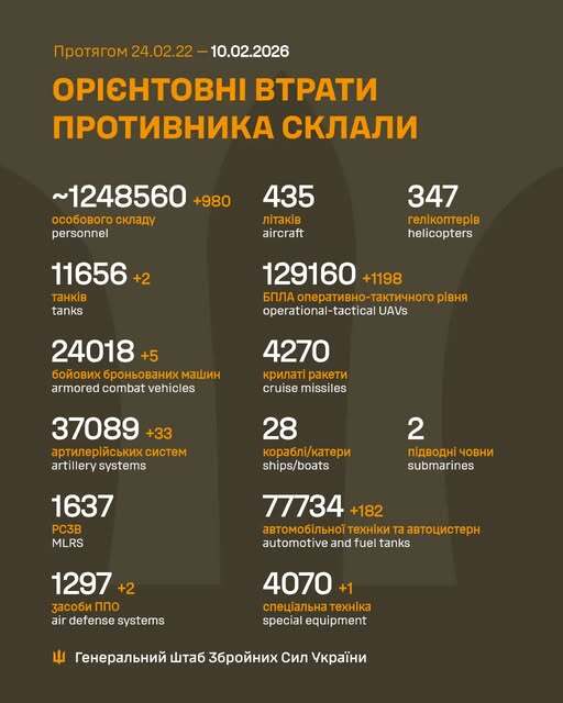 Загалом минулої доби втрати російських загарбників склали 980 осіб. Також ворог втратив два танки, п’ять бойових броньованих машин, 33 артилерійські системи, два засоби ППО, 1198 безпілотних літальних апаратів, 182 одиниці автомобільної та одиницю спеціальної техніки.