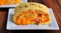 Ингредиенты: Яйца – 8 штукМука – 50 граммМолоко – 200 млСыр – 350 граммПерец болгарский – 1 штукЛук – 1 штукВетчина – 250 граммМасло растите