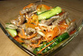 Этот салат из говядины с огурцами можно отнести к корейским салатам, оно готовится с такой же острой маринадной заливкой, и некоторые овощи