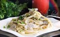 Ингредиенты:200 гр спагетти;200 г шампиньонов;1 плавленный сырок;200 г сливок;1 луковица;1-2 зубчика чеснока;соль, перец, зелень.Приготовлен