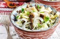 Інгредієнти:сушені гриби - 200 гквашена капуста - 200 гкартопля - 200 гцибуля - 1 штчасник - 2 зубцірослинна олія для смаженнякунжутна оліяс