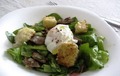 Інгредієнти:300 гр шпинату свіжого150 гр салати4 яйця100 мл оцту100 гр бекону30 мл олії250 мл масла200 гр курячої печінки8 шматків білого хл
