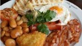 Інгредієнти:1 яйце100 гр бекону (шматочками)2 тости150 гр тушеної квасолі1 помідор (великий)70 гр шампіньйонів (порізані на дольки)2 картопл