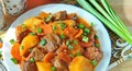 Ингредиенты:Говядина (мякоть) — 0,6 кгКартофель — 900 гЛук — 1 головка.Морковь — 1 шт.Помидоры — 1 шт.Томатный сок — 200 млСоль и любимые сп