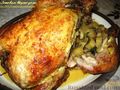 Очень вкусное блюдо – мягкая, сочная запеченная курица, сразу с гарниром (картофель с грибами), который запекается вместе с курицей, внутри.
