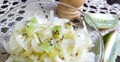 Ингредиенты:киви — 1 шт.лук — 1 шт.сахар — 1 щепоткасоль — по вкусумасло растительное — 2 ст.л.Приготовление:Нарезаем лук четверть кольцами.