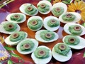 Інгредієнти:яйця : 10-12 шт.шпинат: 200 г.оливки: 10-15 шт.сільСпосіб приготування:Яйця зварити, розрізати навпіл уздовж та вийняти жовтки.Ш
