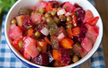 Ингредиенты: 3 картофелины, 1 морковь, 1 свекла, 100 г цветной капусты, 2 яйца, ½ стакана зелёного горошка, 1 ст. л. сахара, ½ стакана смет