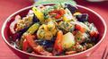 Ингредиенты:Баклажаны — 1 кг;картофель — 500 г;лук репчатый — 2 шт.;помидоры — 500 г;перец болгарский красный — 2 шт.;перец чили красный — 1