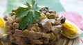 Ингредиенты:отварная говядина или курятина — 300 гзелёный горошек — 1 маленькая банкасоленые огурцы — 3 средниечернослив без косточек — 100