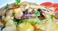 Приготовление:Нарезаем свиную вырезку не крупными кусочками.Кладем мясо на дно формы, солим и перчим.Сверху выкладываем порезанный тонкими к