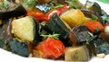 На 500 г баклажанів — по 200 г помідорів і ріпчастої цибулі, 2 1/2 ст. ложки олії, 2 ст. ложки 3-процентного оцту, 1 ст. ложку цукру, н