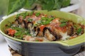 Приготовление:Нарезаем баклажаны тонкими пластинками, слегка обжариваем.Смешиваем свиной фарш с луком, чесноком, яйцом и специями. Распреде